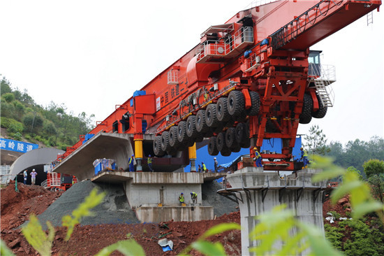 運架一體機自重高達672噸,工作載荷大,是目前較先進的特重型起重設備,采用提梁、運梁、架設三合一模式設計;運架梁作業(yè)時,具有施工速度快,機動靈活,可以在隧道口和隧道內零距離架梁,即便是橋隧橋相連的設計形式,即狐貍坑大橋+竹高嶺隧道+燕子巖特大橋這樣的設計形式,也無需拆解任何部件等優(yōu)點。
