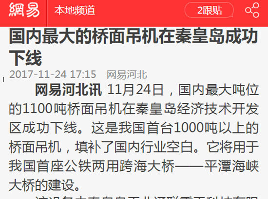 網(wǎng)易新聞:國內(nèi)最大的橋面吊機(jī)在秦皇島成功下線